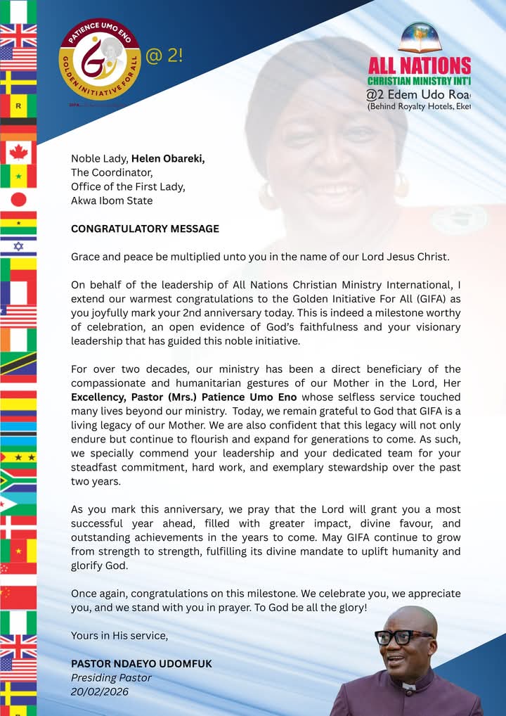 For over two decades, our ministry has been a direct beneficiary of the compassionate and humanitarian gestures of our Mother in the Lord, Her Excellency, Pastor (Mrs.) Patience Umo Eno whose selfless service touched many lives beyond our ministry. Today, we remain grateful to God that GIFA is a living legacy of our Mother. We are also confident that this legacy will not only endure but continue to flourish and expand for generations to come. As such, we specially commend your leadership and your dedicated team for your steadfast commitment, hard work, and exemplary stewardship over the past two years.