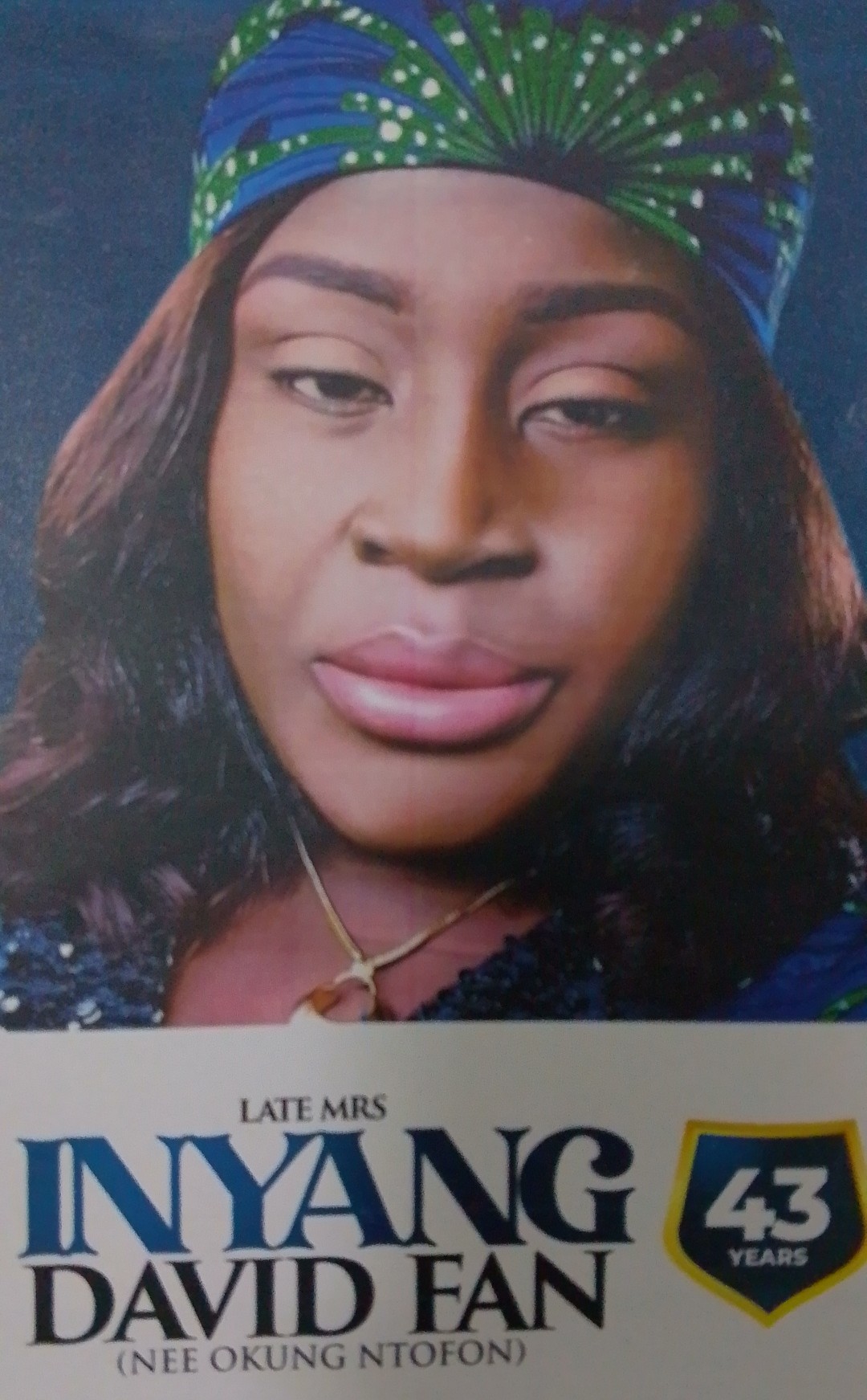Born 43 years ago into the royal family of Late Elder (Chief) Okung Okung Ntofon and Mrs. Nene Okung Ntofon of Mbokpu Uko Akan in Urue Offong Oruko, Late Mrs Inyang was the first daughter in the family of four.